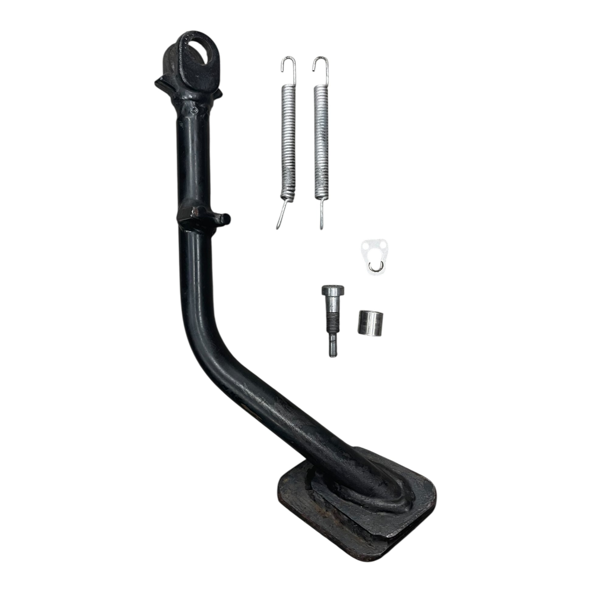 BMW K25 R1200GS side stand with widened support surface including mounting material: side stand screw, sheet metal bracket, tension springs, bushing.